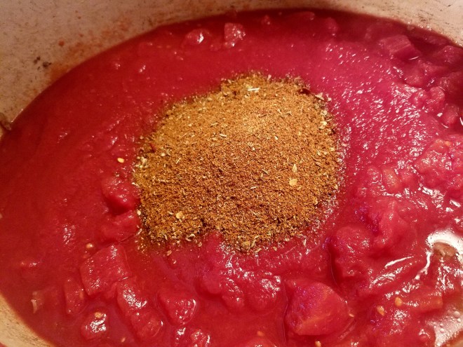 Add the beef and slightly brown It. You still want to see some pink!! While the meat is draining in a colander, the puréed and diced tomatoes get added to the pot, along with the toasted spices.