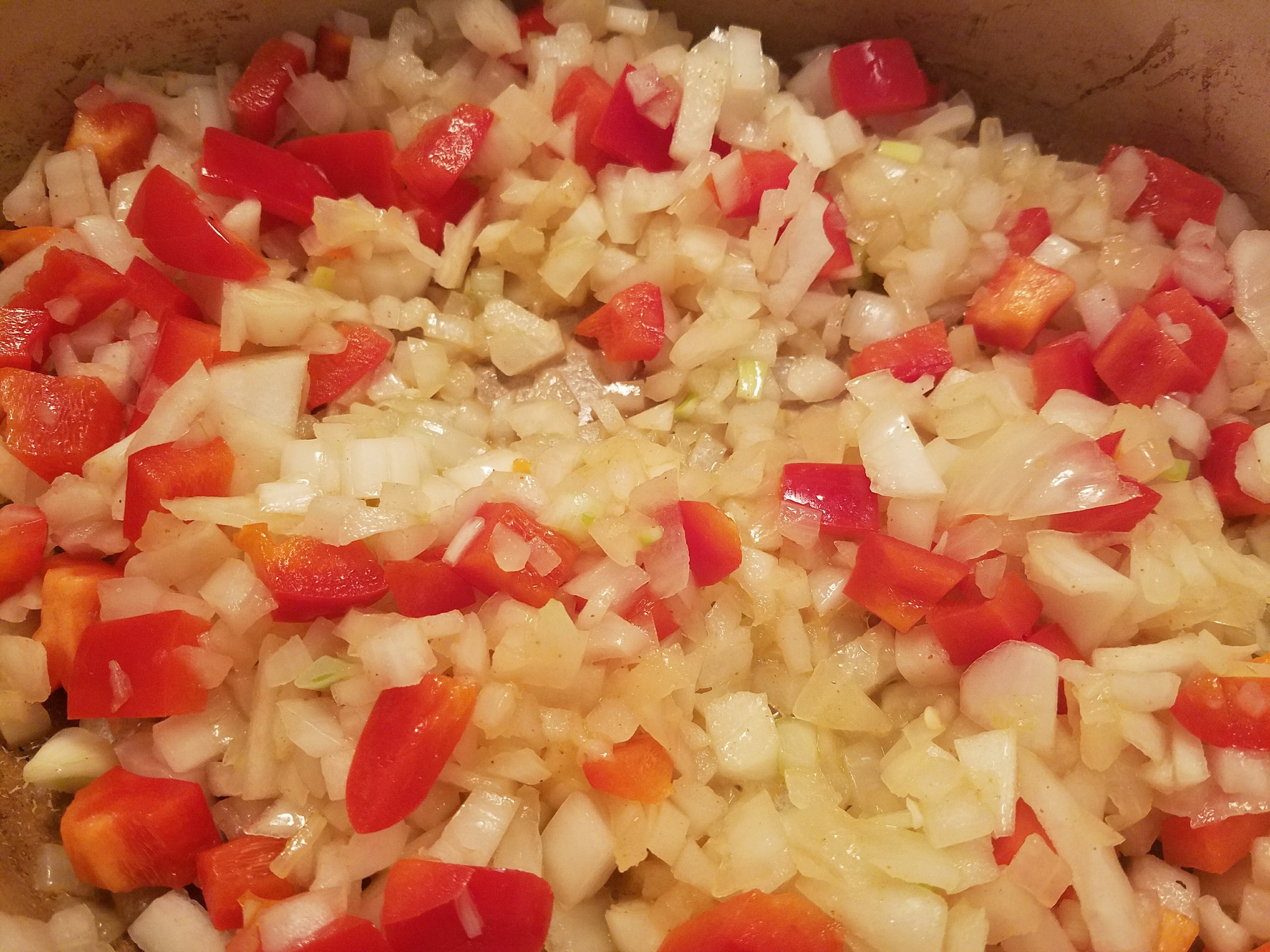 Next is the softening of the red bell pepper and the onion. I prefer to season as I go so each step gets a bit of salt.